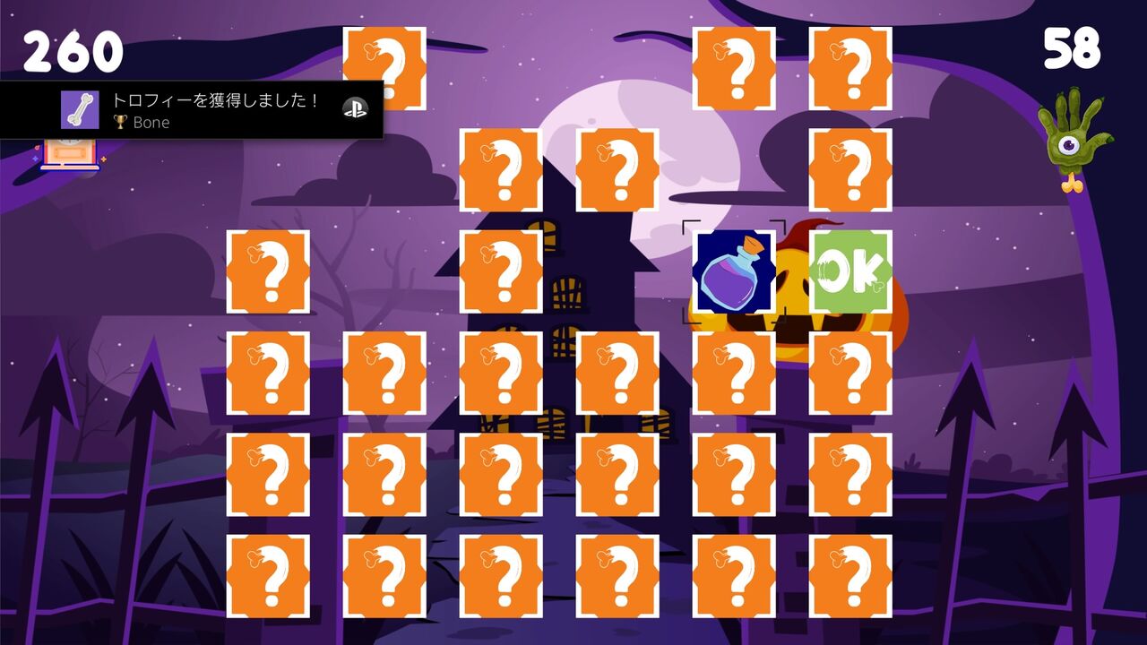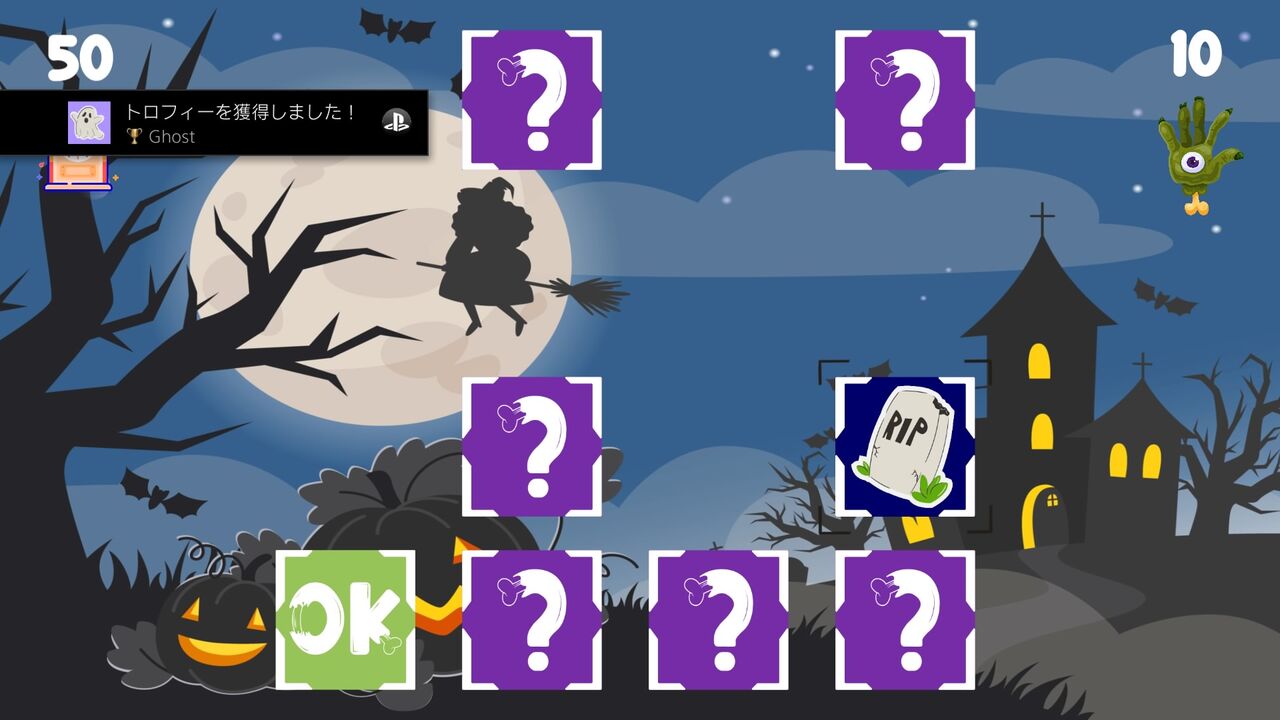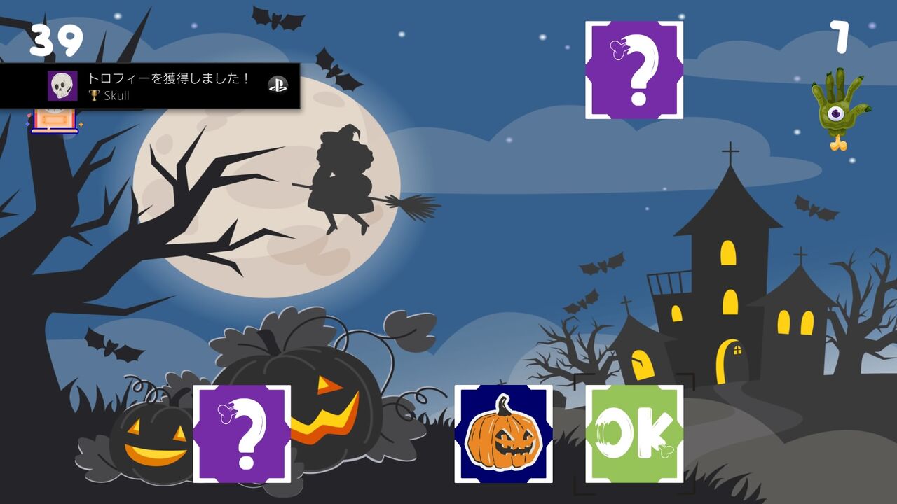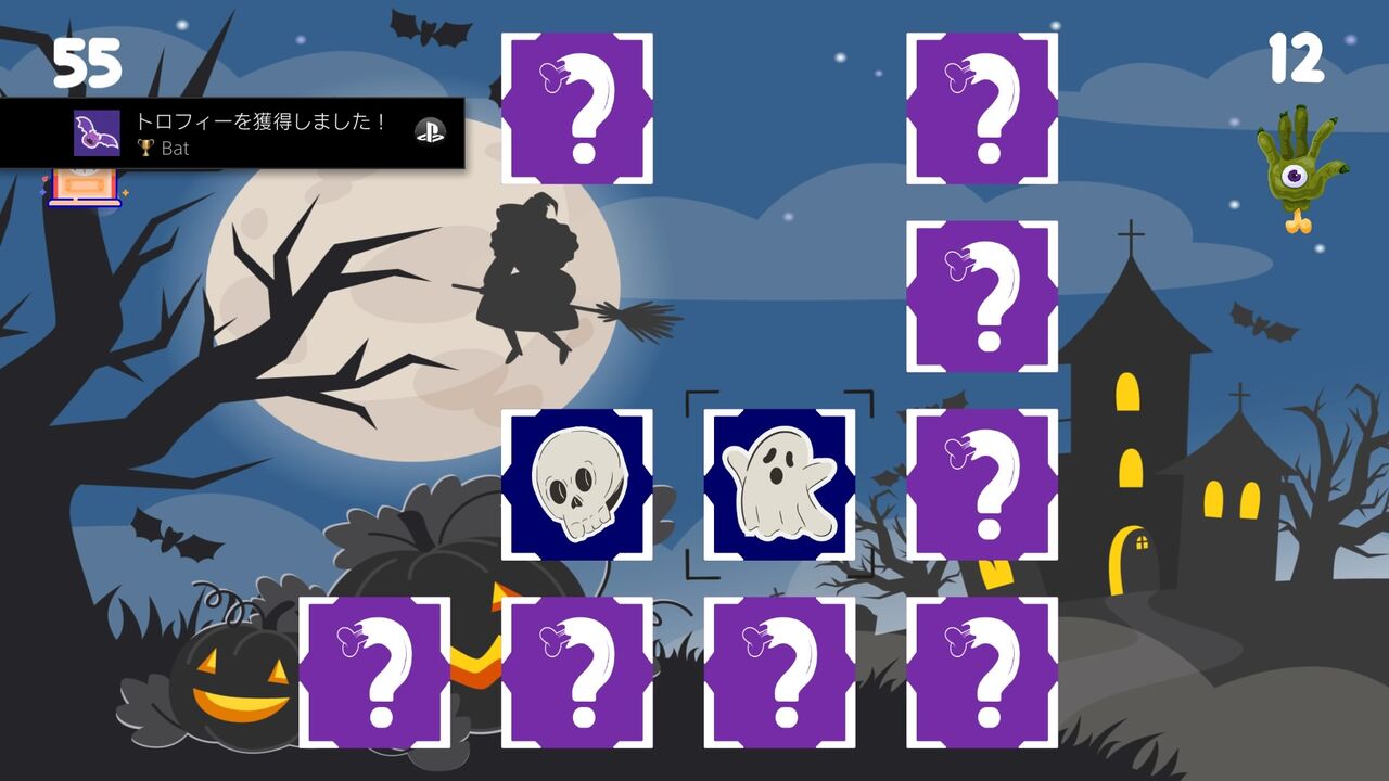 神経衰弱をやっている過程で、カボチャ、魔女の帽子、幽霊、ガイコツ、コウモリ、ほうき、骨、フクロウのカードを揃えることで獲得できる。