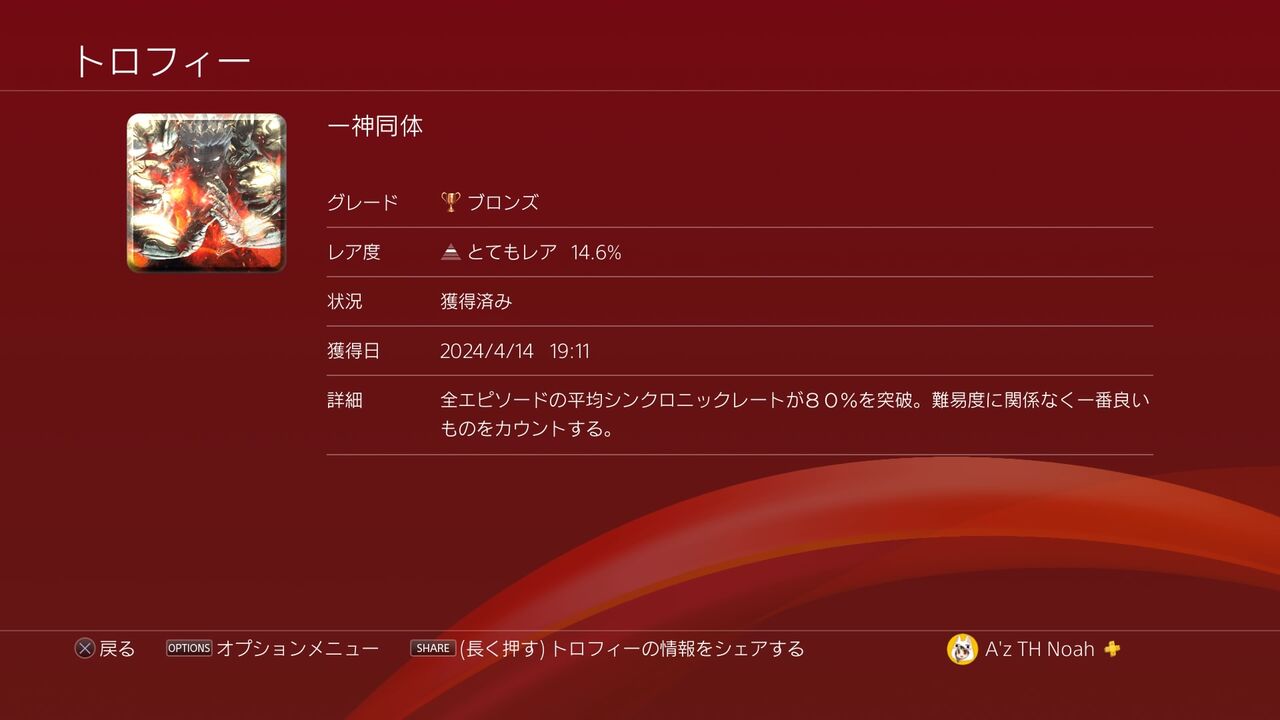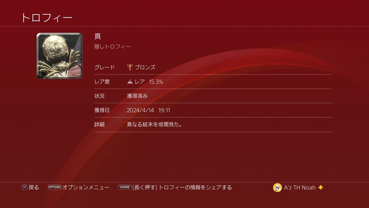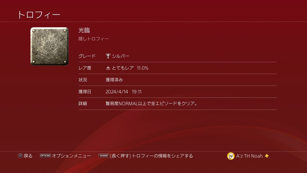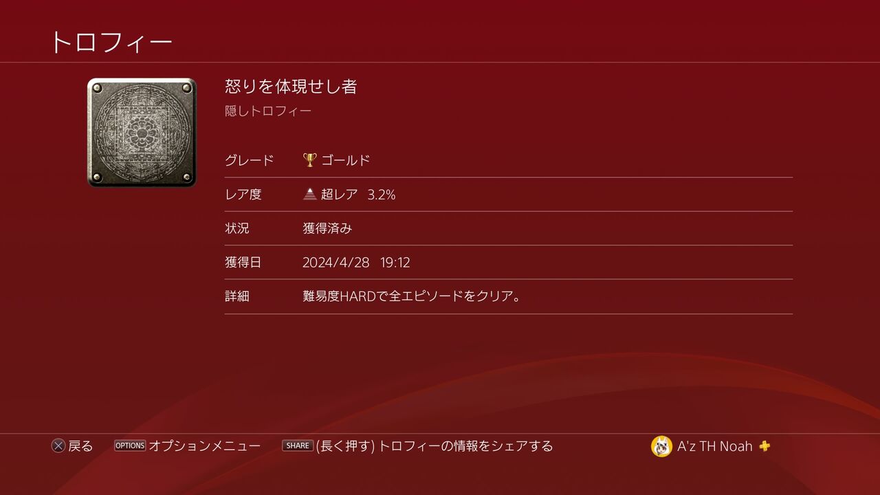 こちらのトロフィー自体は、難易度HARDでストーリーをクリアすることで両方獲得できますが、どうせ難易度NORMALと難易度HARDで2周はすることになるので、別々で取れば良いと思います。
