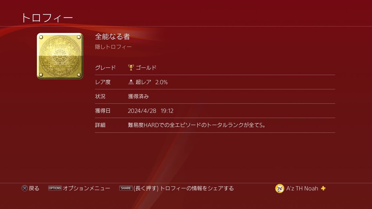 難易度HARDでの全エピソードのトータルランクが全てS。