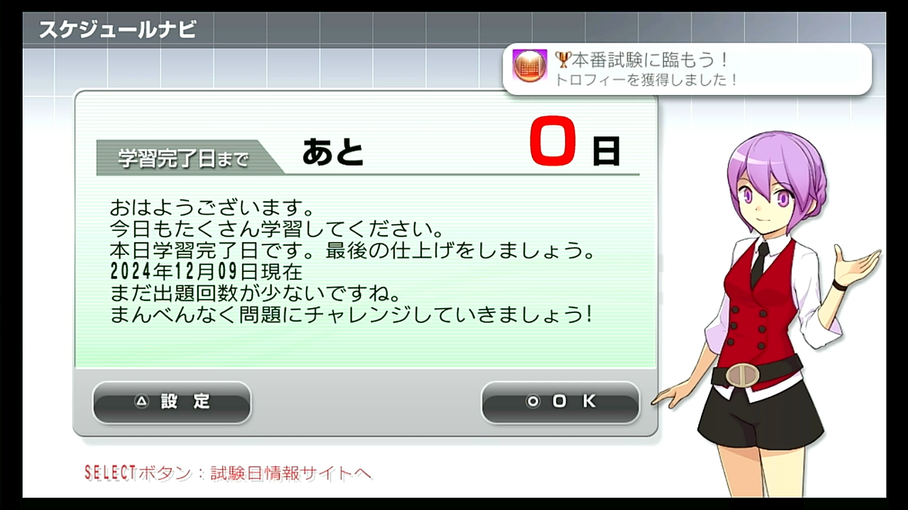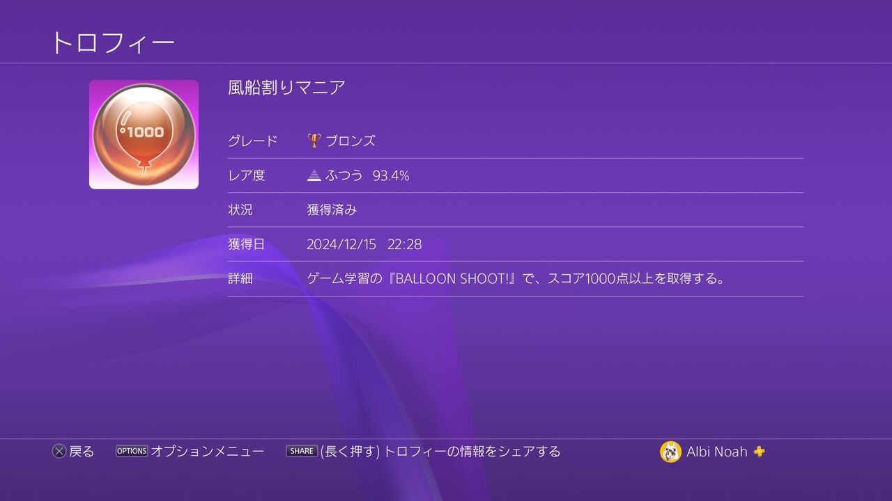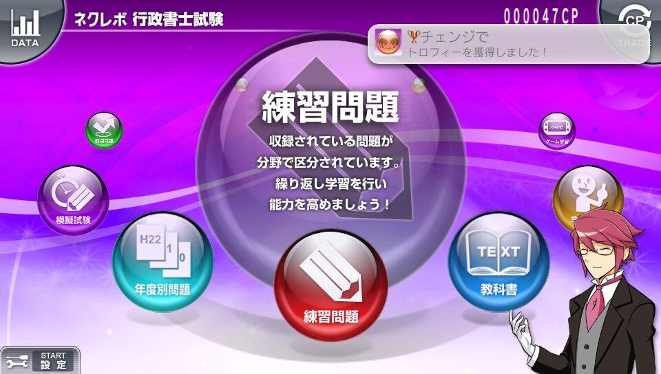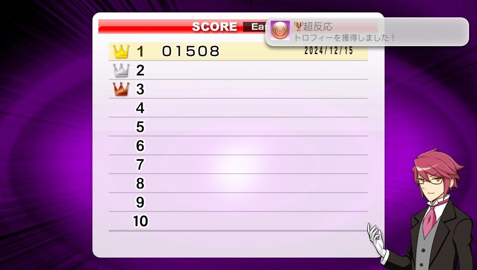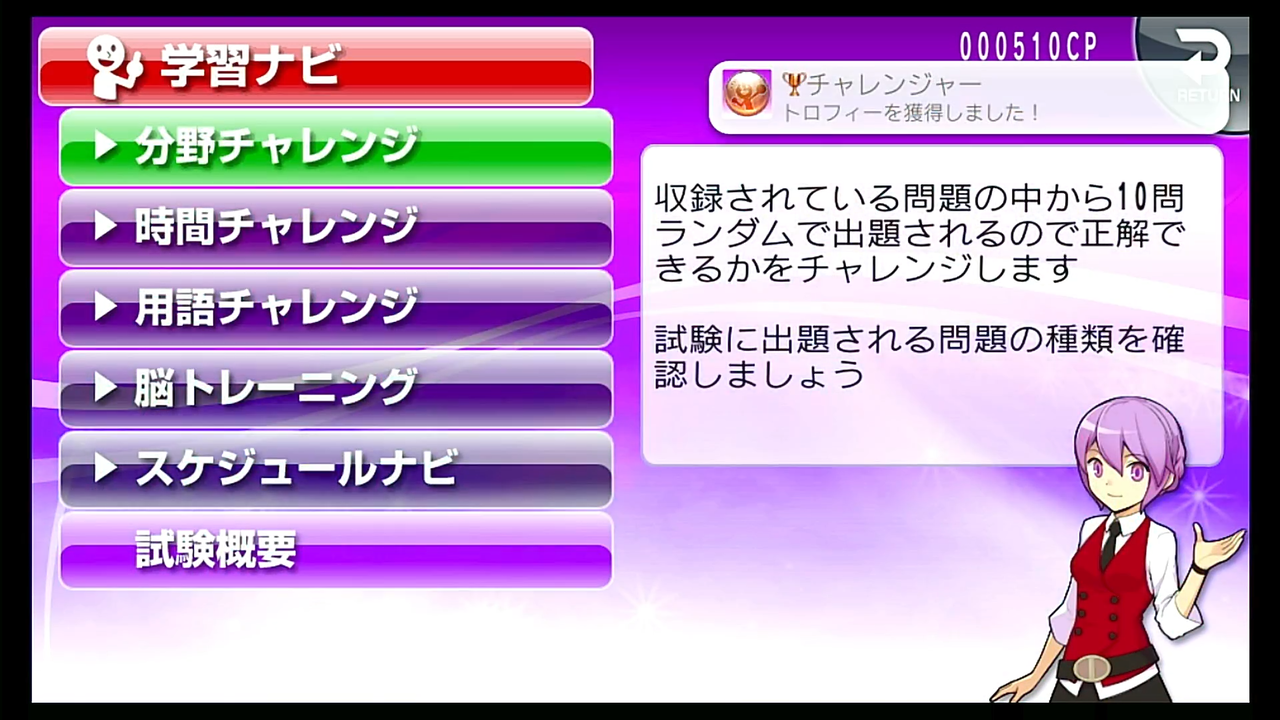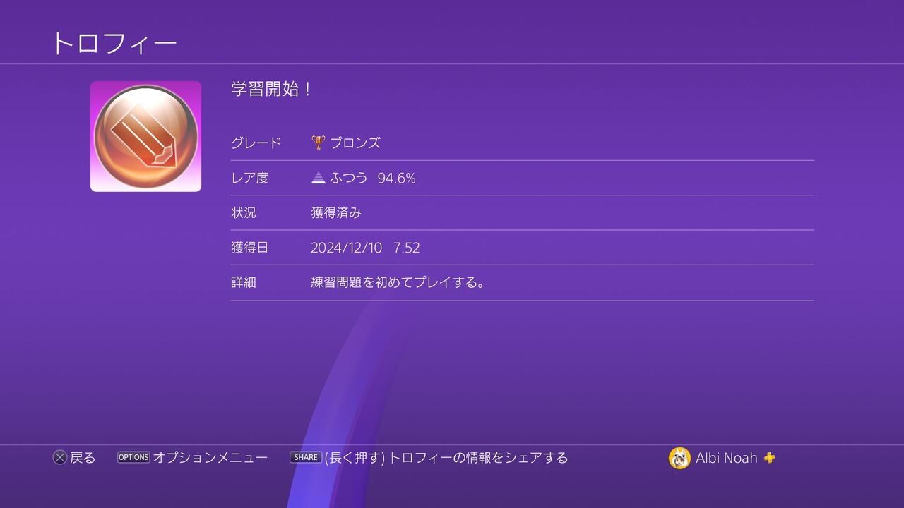トロフィー獲得のタイミングは、問題を解き終えてメニュー画面に戻ったタイミング。