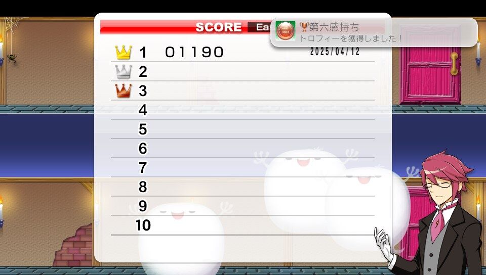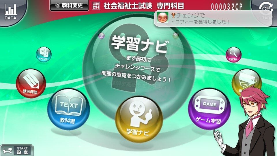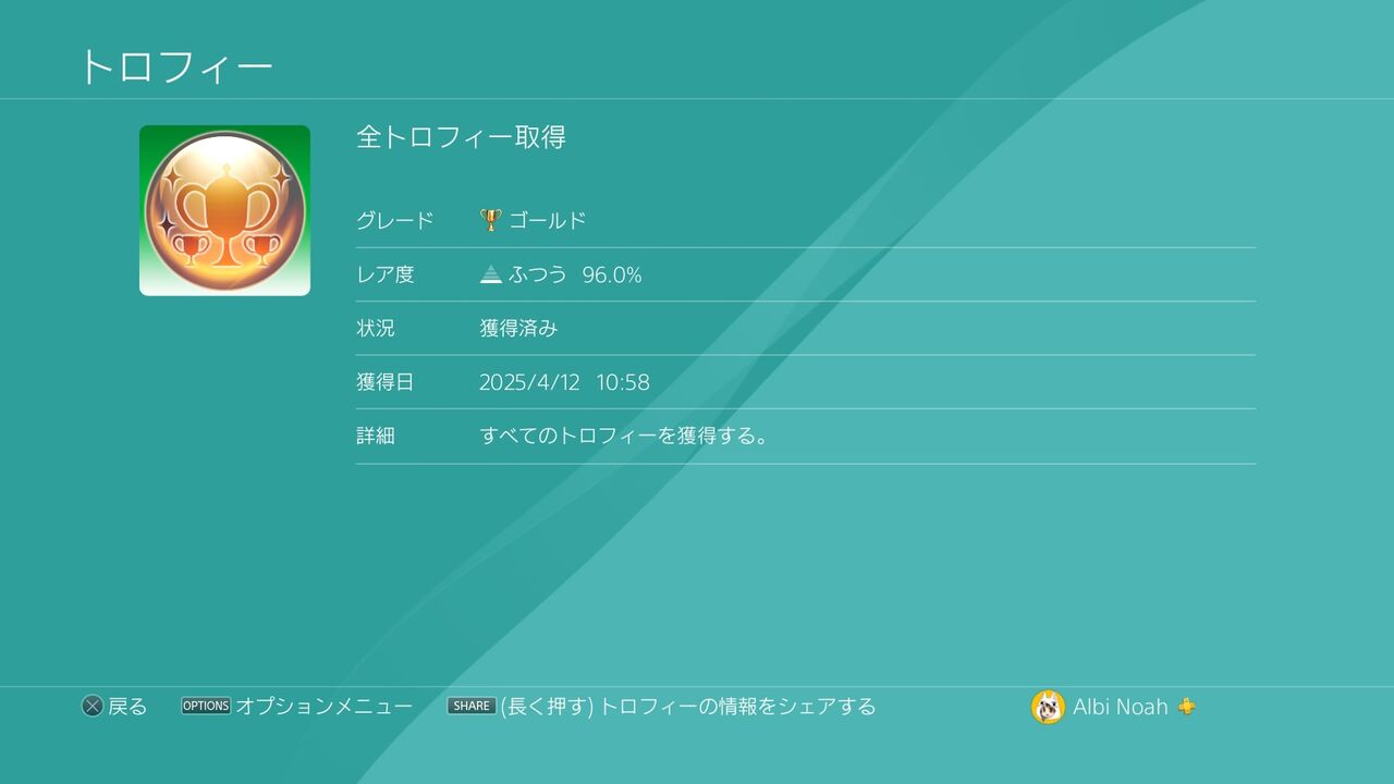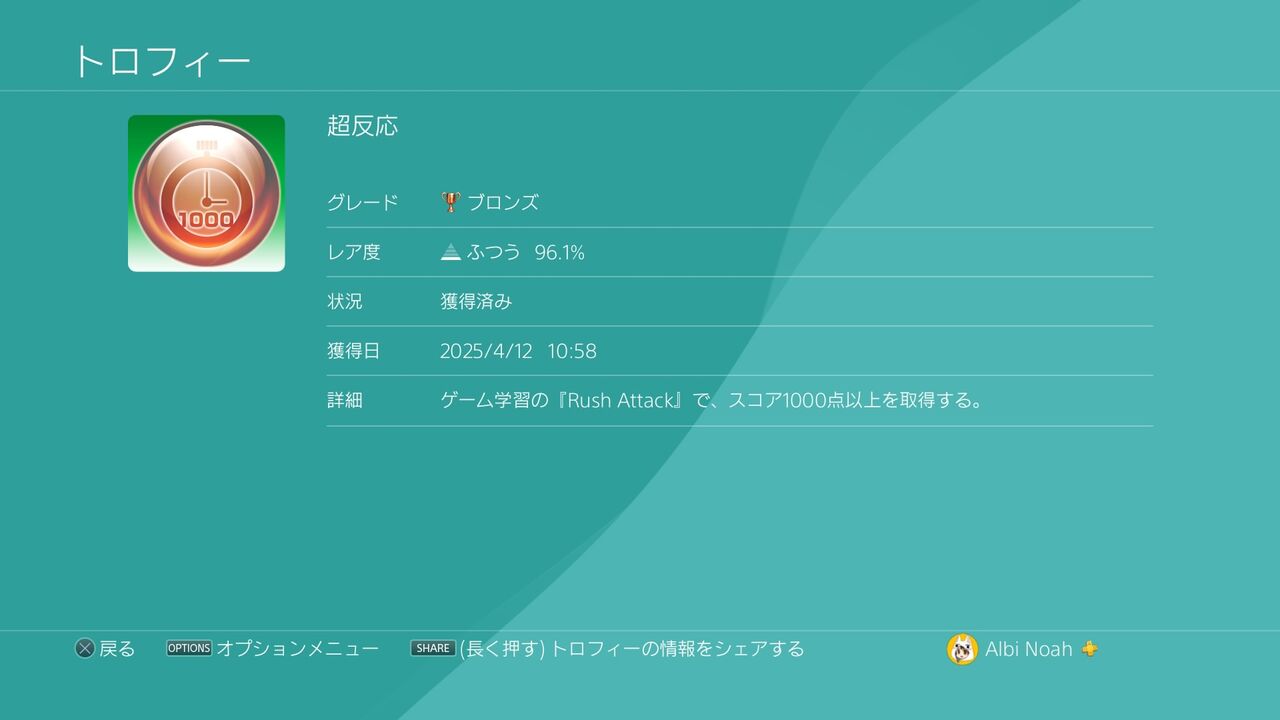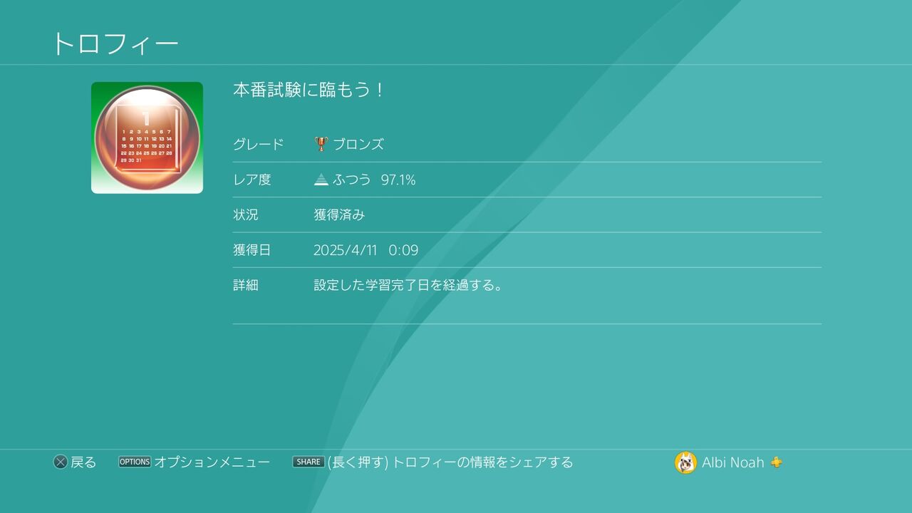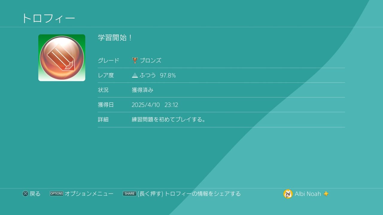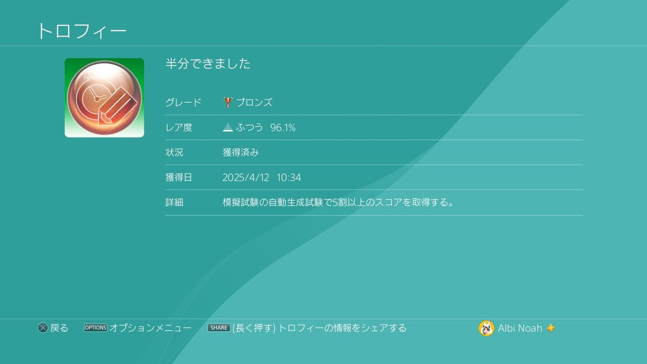 トロフィー獲得のタイミングは、問題を解き終えてメニュー画面に戻ったタイミング。