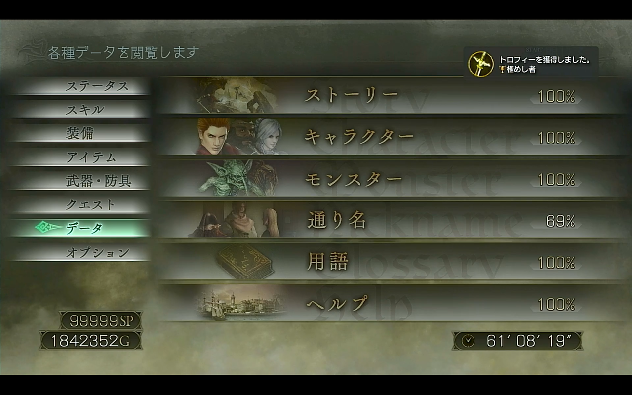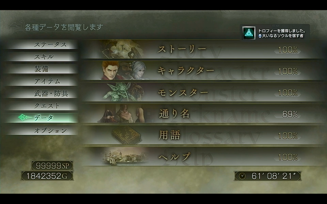 トロコンまでは、ゲーム内プレイ時間で61時間程。