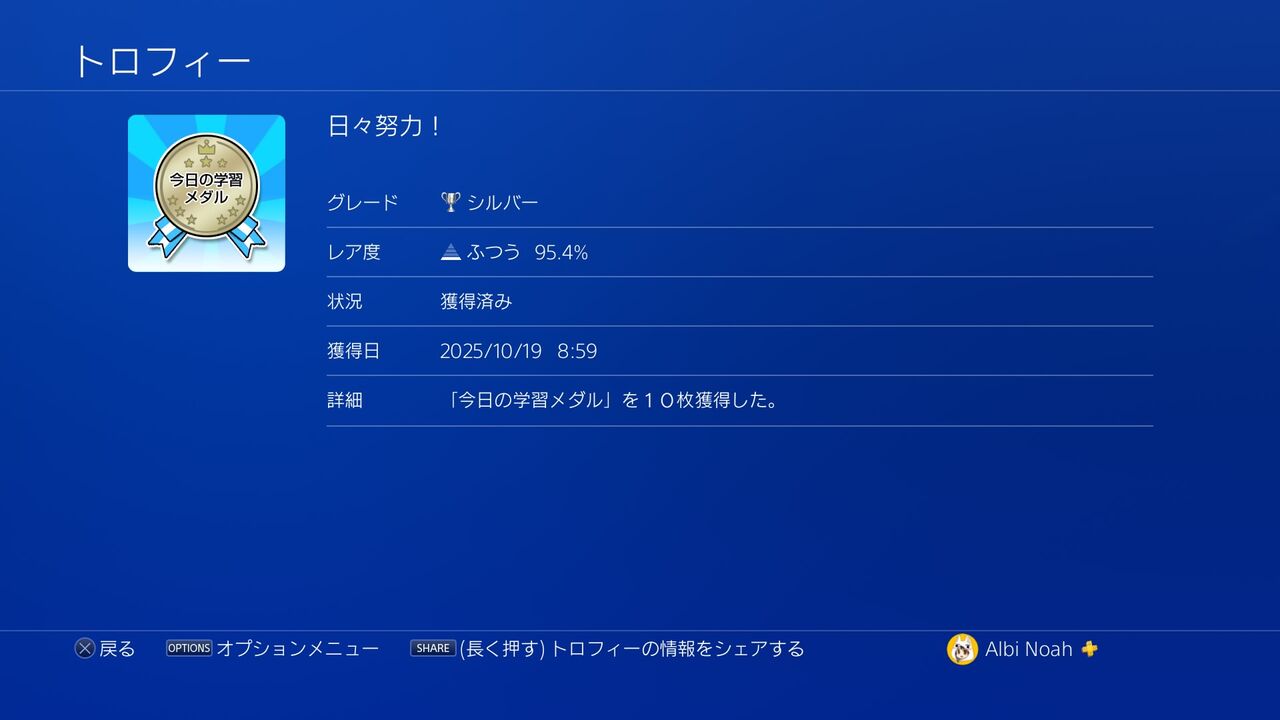 ちなみに、問題を間違えた回数で多少前後しますが、僕がトロコンした際の今日の学習メダルの数は68個でした。