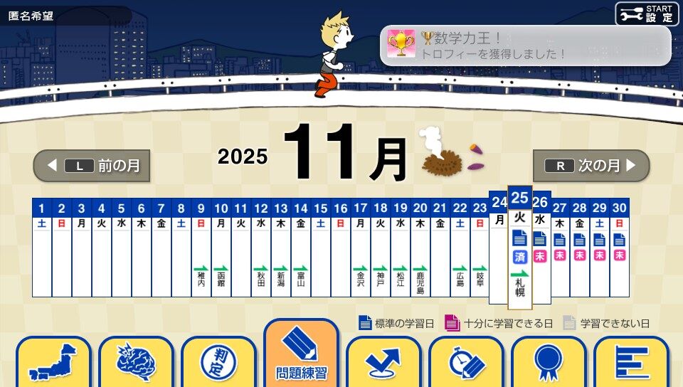 これでメインメニューに戻ると、1日15分の学習がリセットされて再度行えるし、出題も「正負の数」しか出なくなるのでオススメ。